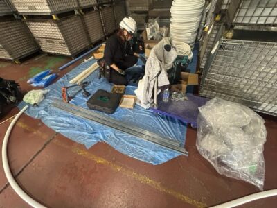全体空調は初期費用・ランニングコストともに大きな負担となるため、当社ではスポットクーラーを11基導入し、それぞれに3本ずつダクトを接続することで、合計33箇所の吹出口を設けました。これにより、作業員一人ひとりに冷気を行き渡らせる設計が可能となり、工場内の作業環境は大きく改善され、現場からも高い評価をいただいております。さらに、空調機器の設置からダクト工事までの全工程をわずか7日間で完了し、短納期での施工を実現いたしました。